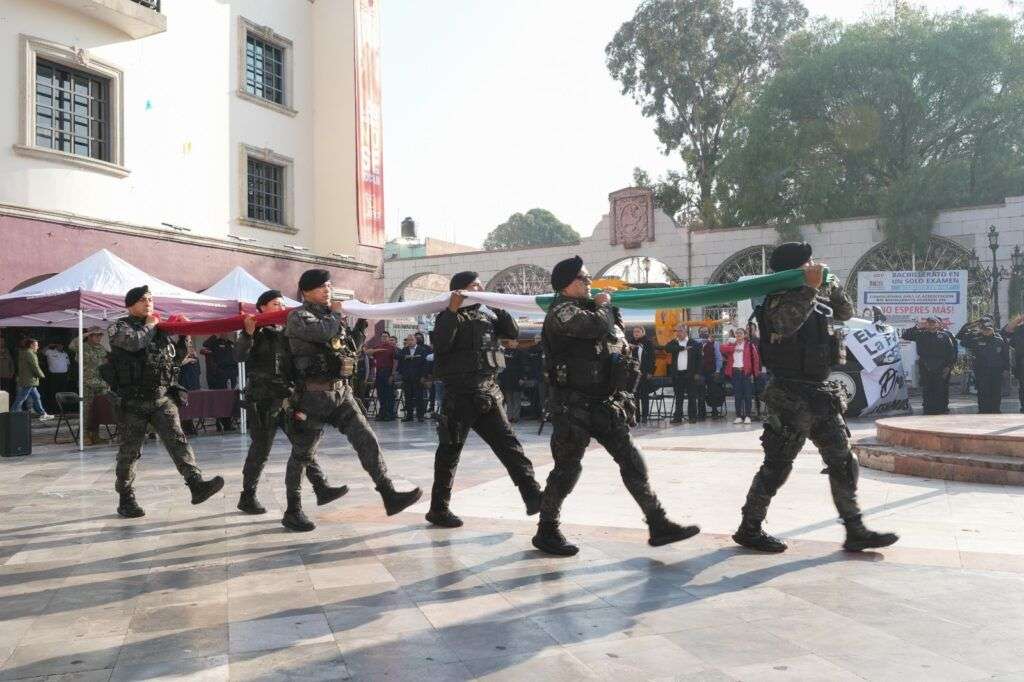 En un segundo momento del acto, y como parte del protocolo mensual, se llevó a cabo el Izamiento de Bandera en la Plaza General Luis Cerón, encabezado por la presidenta municipal Martha Guerrero Sánchez. En la ceremonia participaron elementos de Marina, Policía Estatal y Municipal, Protección Civil, estudiantes y servidores públicos.