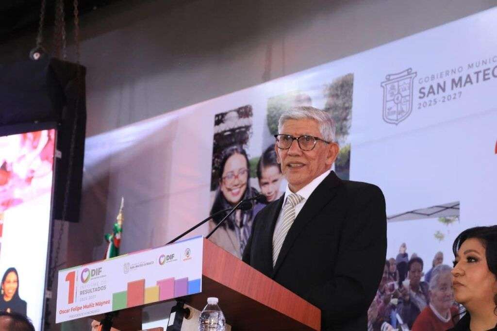 San Mateo Atenco, Estado de México, 27 de noviembre de 2025.- El presidente honorario del Sistema Municipal DIF, Oscar Felipe Muñiz Máynez, rindió el Primer Informe de Resultados del organismo ante el Lic. Sem Yesuí Mejía Juárez, coordinador de Atención a Adultos Mayores del Sistema para el Desarrollo Integral de la Familia del Estado de México y representante de la directora general, Mtra. Karina Labastida Sotelo, acompañado por la presidenta municipal Ana Muñiz Neyra e integrantes del Ayuntamiento.