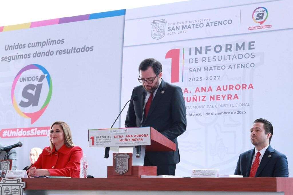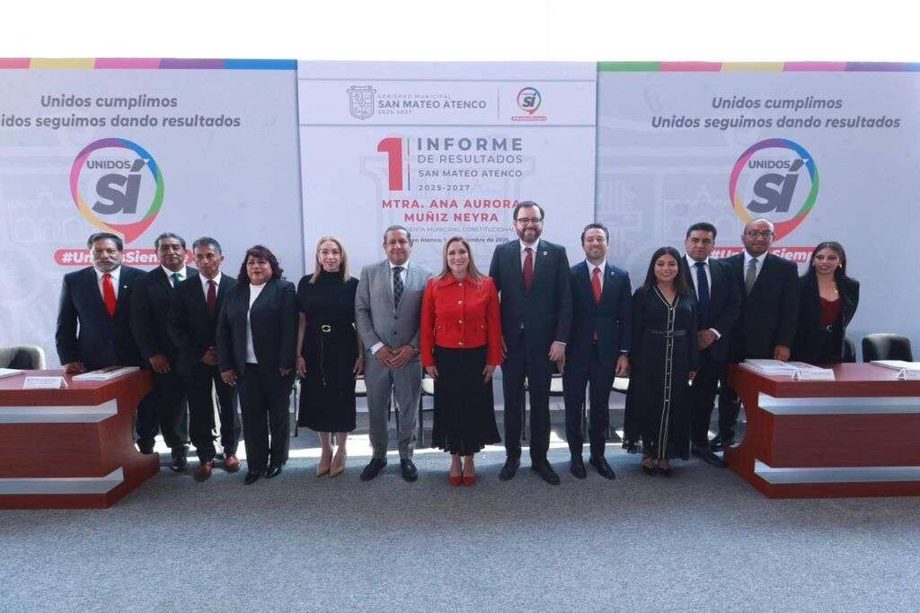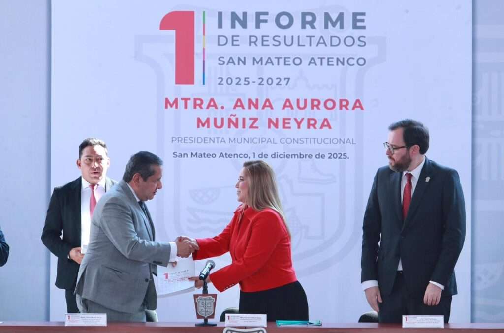 San Mateo Atenco, Estado de México, 1 de diciembre de 2025.- “Los atenquenses estamos resueltos a seguir la ruta del desarrollo, unidos y decididos a llevar a nuestro municipio hacia un futuro de igualdad y progreso, sin dejar a nadie atrás”, así lo afirmó la presidenta municipal Ana Aurora Muñiz Neyra, al rendir el Primer Informe de Resultados de la administración 2025-2027.