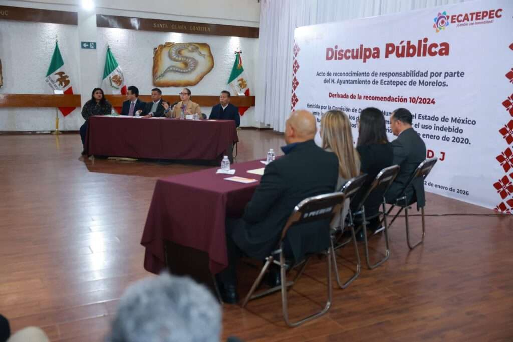 Ecatepec, Méx., a 22 de enero de 2026. La alcaldesa Azucena Cisneros Coss ofreció, a nombre del Ayuntamiento, una disculpa pública a la sociedad y a familiares de un ciudadano que murió derivado del uso excesivo de la fuerza de policías municipales, en hechos ocurridos el 17 de enero de 2020, durante la administración municipal 2019-2021, y por los que la Comisión de Derechos Humanos del Estado de México (Codhem) emitió la recomendación 10/2024.