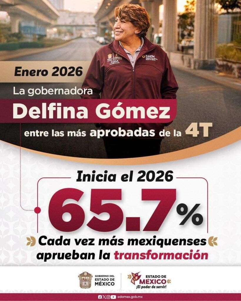 Toluca, Estado de México.– La gobernadora Delfina Gómez Álvarez inició 2026 con una aprobación ciudadana del 65.7 por ciento, colocándose entre las mandatarias mejor evaluadas del país dentro de los gobiernos alineados a la Cuarta Transformación, de acuerdo con los datos difundidos en enero de este año.