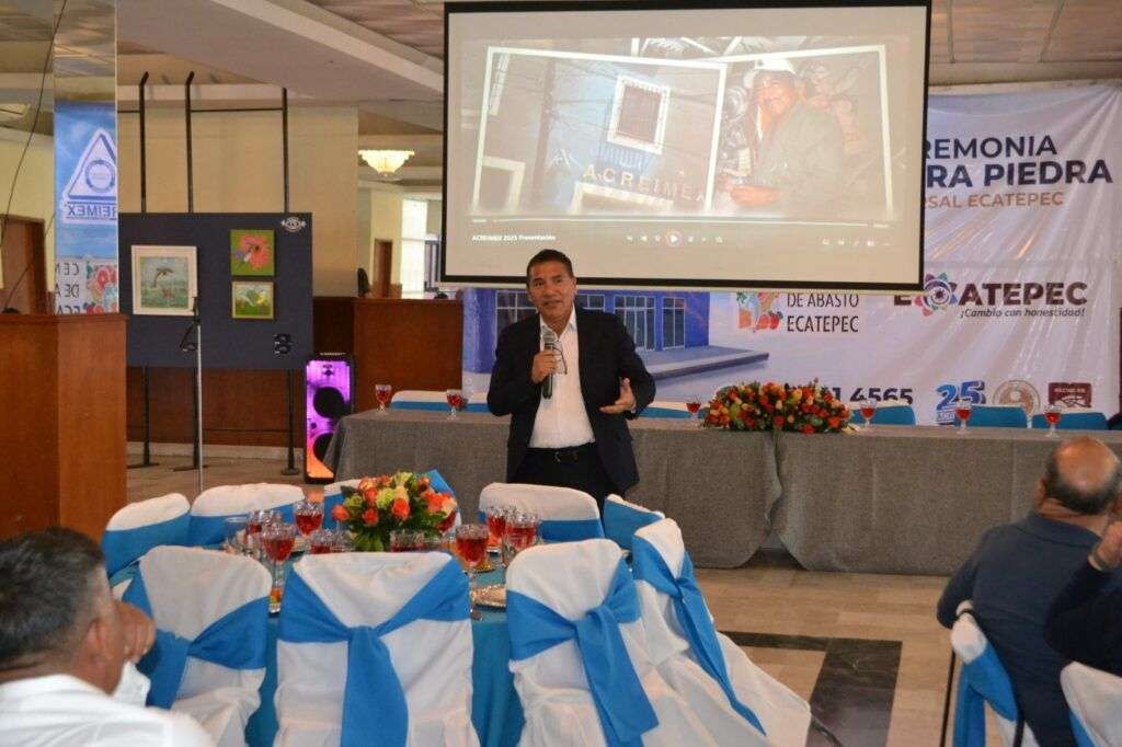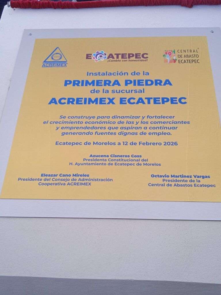 Ecatepec, Estado de México.— Integrantes de la Mesa Directiva de la Central de Abasto de Ecatepec (CEDAE), en coordinación con representantes de la cooperativa financiera ACREIMEX, colocaron la primera piedra de la sucursal que se construirá al interior de esta importante área comercial, con el objetivo de ofrecer alternativas de financiamiento más accesibles para comerciantes, trabajadores y público en general.